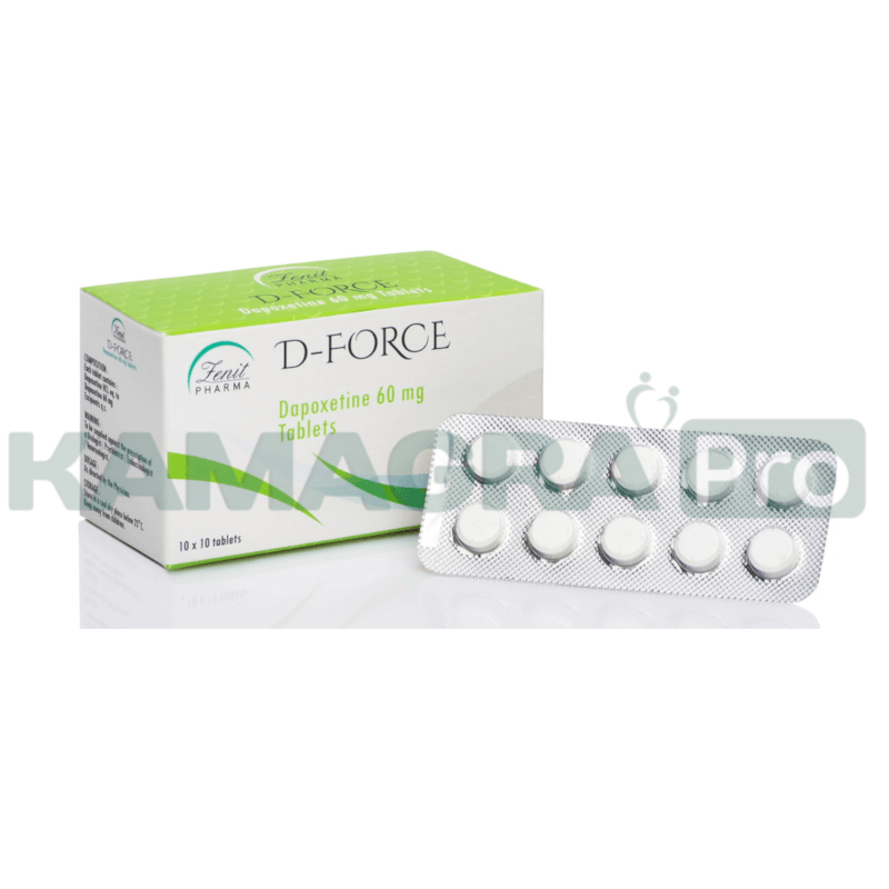 D-Force není afrodiziakum a bude vyžadována stimulace k rozvoji erekce.Dapoxetine D-force 60 mg je bezpečný a účinný lék proti předčasné ejakulaci, kdy bylo klinicky testováno a prokázáno, že při užití 60mg Dapoxetine došlo k prodloužení sexuálního styku, tedy doby k vyvrcholení na trojnásobek a zároveň k lepší kontrole nad ejakulací. Dapoxetine patří mezi inhibitory zpětného vychytávání serotoninu (SSRI).